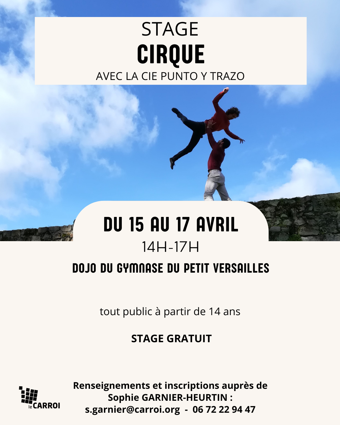 Previous Next Spectacles à venir ven. 3 avril Théâtre d’objets ERSATZ JULIEN MELLANOCOLLECTIF AÏE AÏE AÏE jeu. 9 avril Théatre WALLY MA DISTINCTION mar. 28 avril Théatre L’EXPLOITATION À LA COOL CIE EL AJOUAD Toute la programmation Les rendez-vous à venir Du 8 avril au 3 mai Exposition « Petites bêtes… » Une photo / un tableau Du 15 avril au 17 avril Stage de cirque Portés acrobatiques jeu. 16 avril Sortie de résidence Cie Bravache - L’Odyssée Tous nos rendez-vous Du côté des activités Ludothèque Toutes les infos sur la ludothèque Activités Découvrir toutes les activités Stage À QUATRE MAINS Toutes les activités Tous les stages