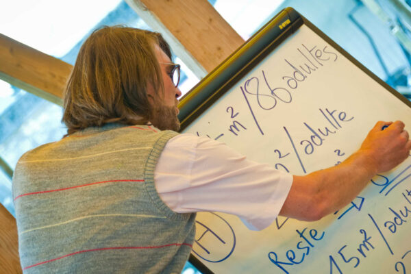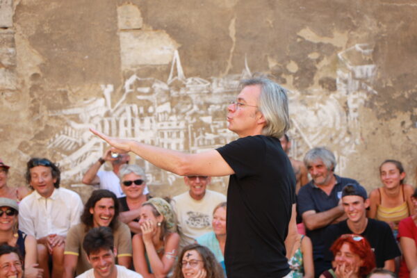 En cercle, faces au centre, nous allons donner à voir le monde. Les intérêts sont multiples. Les gens ne sont pas d’accord. Des idéologies s’affrontent. Et nous, nous qui faisons ce spectacle, qu’est-ce que nous faisons là ? Si l’injustice est aussi criante et nous est si insupportable, sommes-nous à la bonne place ? Faut-il mettre nos corps en jeu, encore un peu plus ? Et s’il fallait y voir de la beauté pour continuer à lutter ? Parce qu’il faut lutter. Mais il faut que ce soit beau. Sinon c’est nul. Prends-moi dans tes bras, et je trouverai la force de continuer.